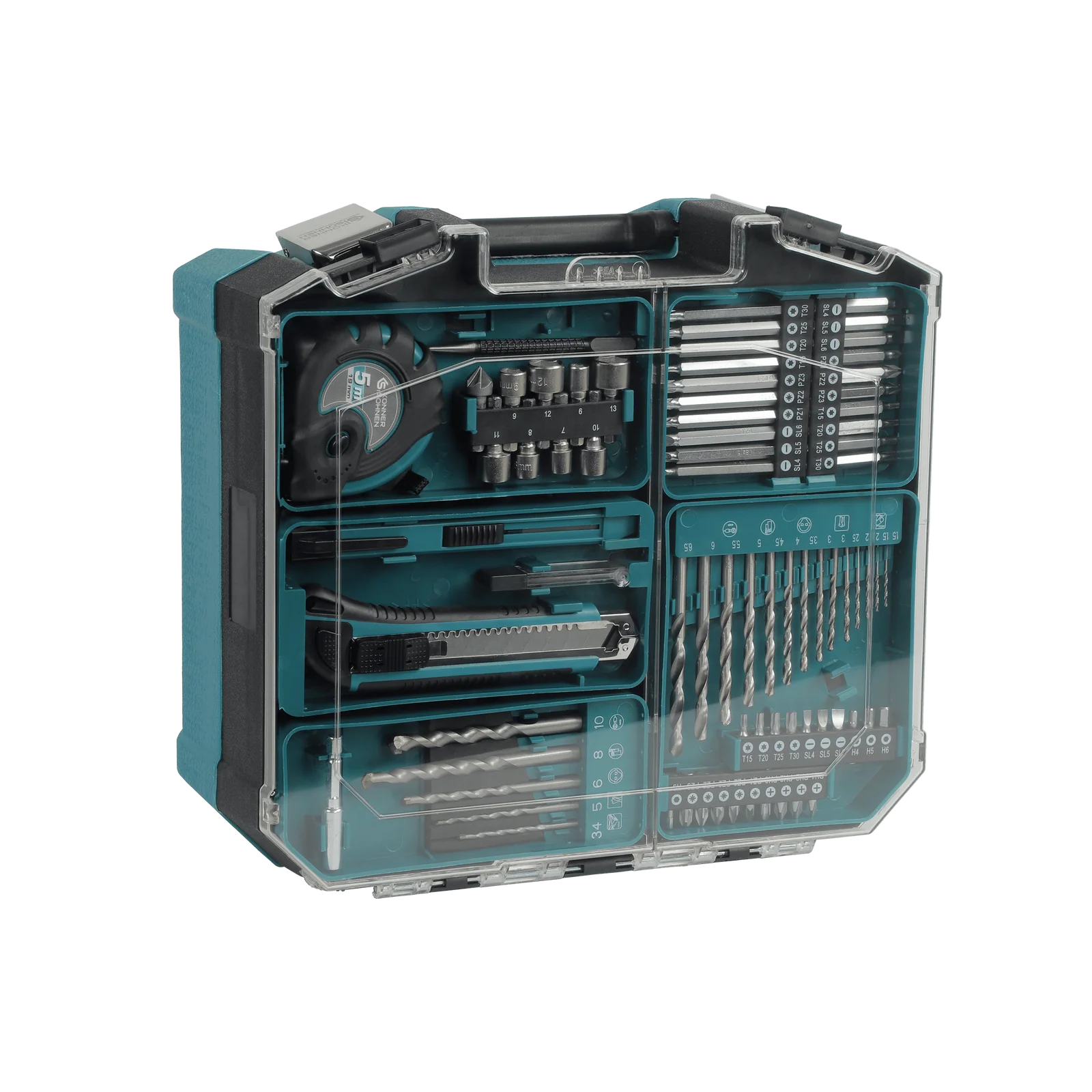 Kõik osad on paigutatud tugevasse plastkohvrisse, mis teeb komplekti transportimise ja hoiustamise mugavaks. See on eriti praktiline neile, kes liiguvad sageli objektide vahel või soovivad hoida töövahendid korrastatult ühes kohas.
