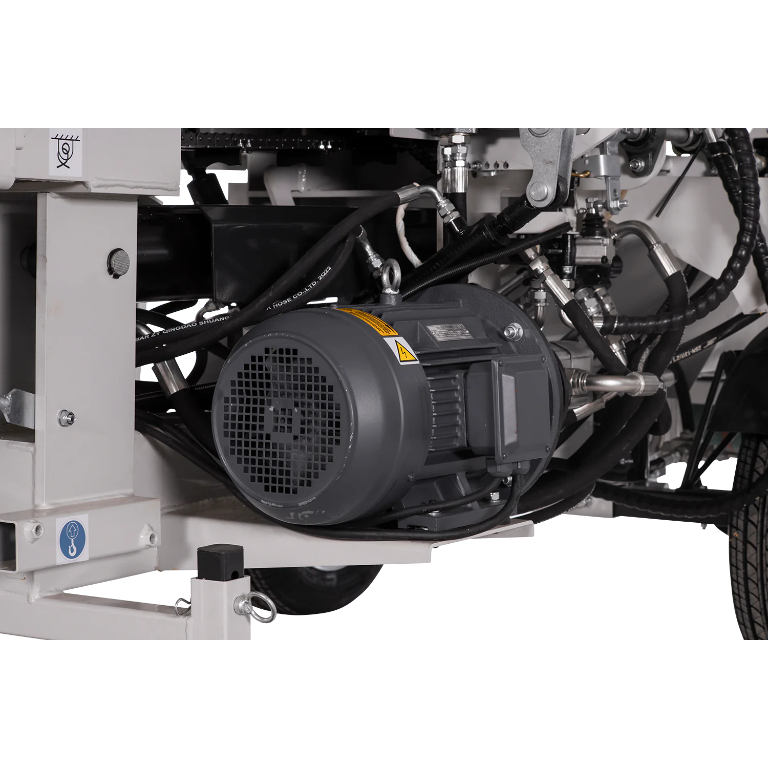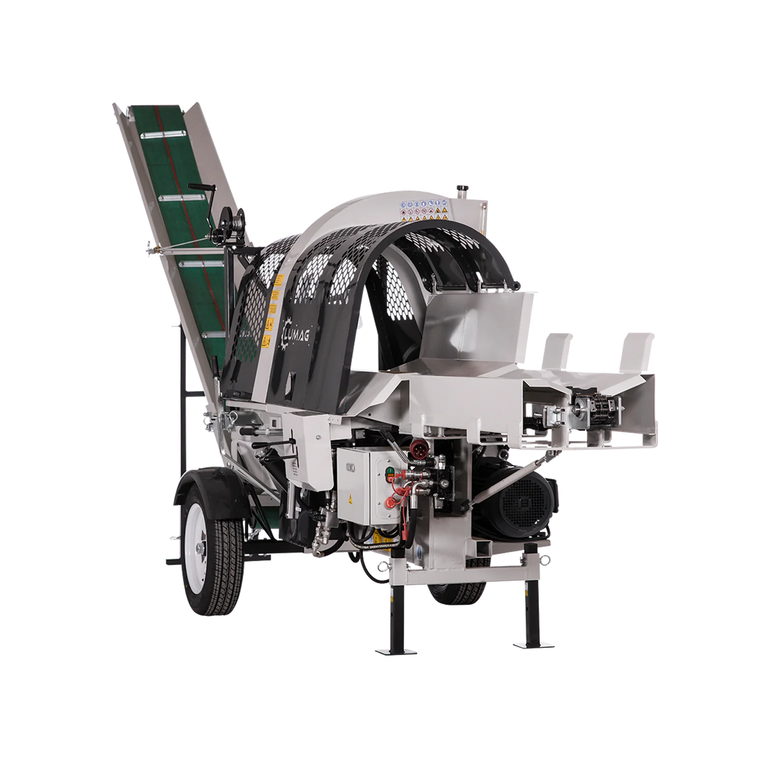 Materjali automaatne eemaldamine lintkonveieri abil muudab töö veelgi lihtsamaks. Võimas 9,5 kW elektrimootor võimaldab kiiret tööd ka suuremate, 50 cm läbimõõduga palkidega. Hüdrauliline kettsae ja palgihoidja töö tagab kiire ja lihtsa töö. Integreeritud hüdrauliline etteandekett varustab sae-lõhkumismasinat materjaliga. Komplekti kuulub nii juhtventiilide komplekt kui ka PARKER pump ja hüdromootor.