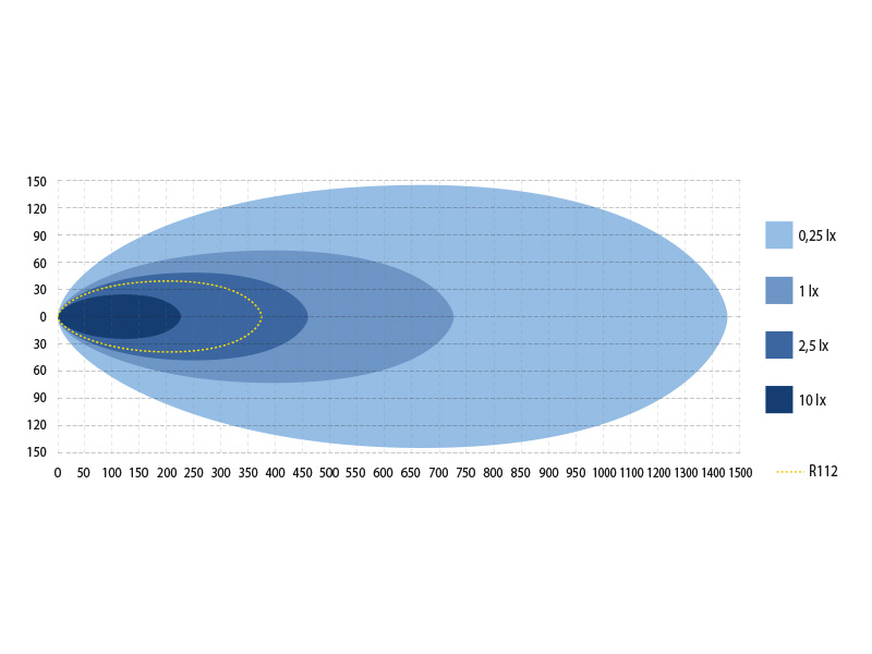 Selle tulemusena on nähtavus juba väga ulatuslik: 1 lux tasemel kantavus võib standardrežiimis ulatuda umbes 374 meetrini ja võimsamas “Double Up” režiimis kuni ~725 meetrini või enam (vastavalt versioonile).