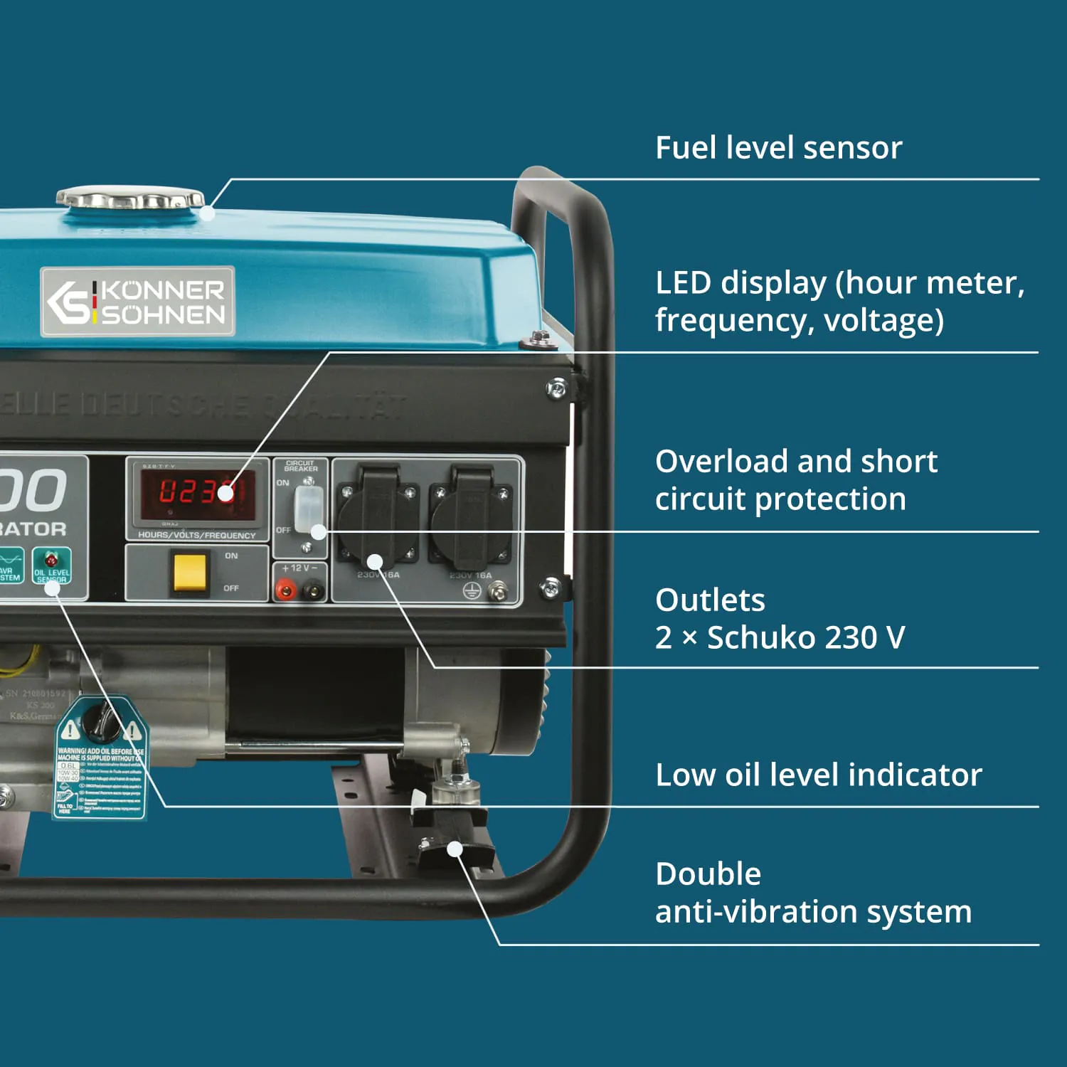 KS 3000 on varustatud voltmeetri, õlitasemeanduri ja ülekoormuskaitsega. Need funktsioonid aitavad vältida kahjustusi. Generaator lülitub välja, kui õlitase on liiga madal. See tagab pika tööea ja ohutu kasutuse.