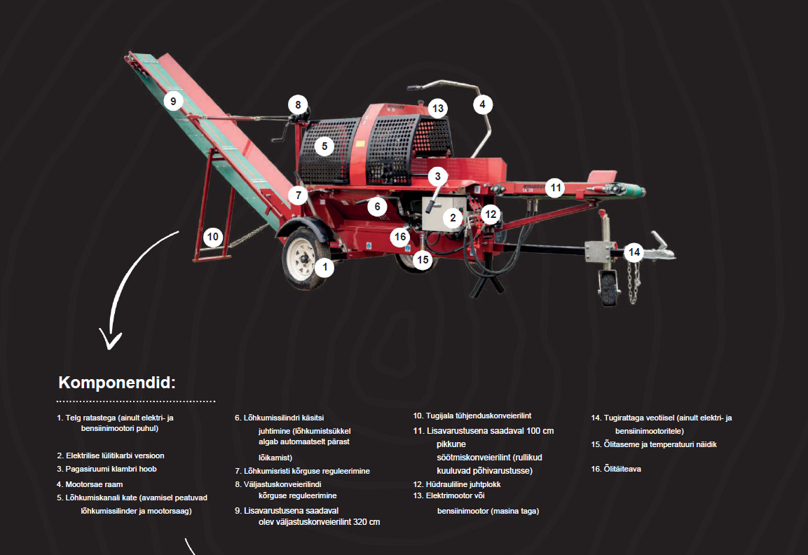 Halumasinate töö põhineb võimsal hüdrosüsteemil, mis surub halu vastu teravat lõhkumistera. Selline mehhanism tagab ühtlase ja kontrollitud lõhkumise, võimaldades töödelda erineva läbimõõdu ja tihedusega puitu. Masinad saavad edukalt hakkama nii pehmema kui ka kõvema puiduga, sealhulgas tamme, saare või vahtraga. Tänu stabiilsele raamile püsib seade töö ajal kindlalt paigal, vähendades vibratsiooni ja parandades tööohutust.