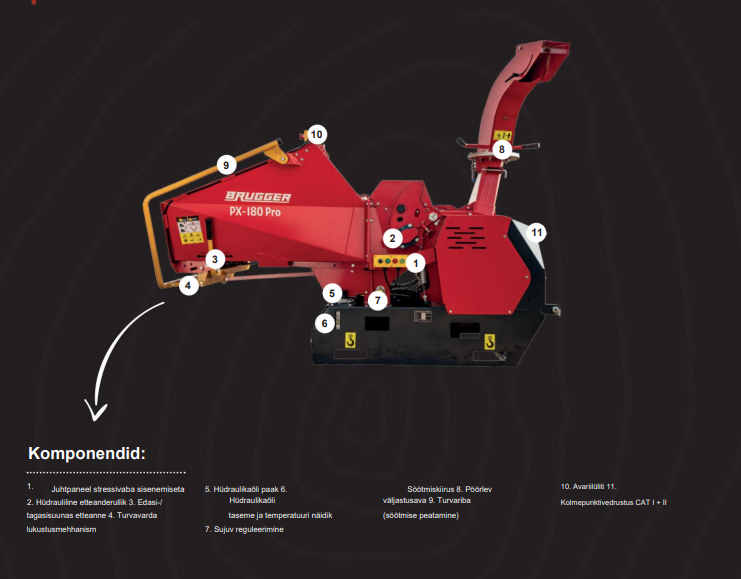 Brugger PTO oksapurustajad on spetsiaalsed mehaanilised seadmed, mis on mõeldud puidu ja okste purustamiseks ning hakkimiseks erinevatel tööstus- ja põllumajanduslikel eesmärkidel. Need masinad töötavad traktori jõuvõtuvõlli kaudu, mis tagab vajaliku jõu purustustööks. Seadme konstruktsioon on robustne, valmistatud vastupidavatest terastaladest ja tugevdatud hammastest, mis tagavad pika tööea ka intensiivse kasutuse korral.