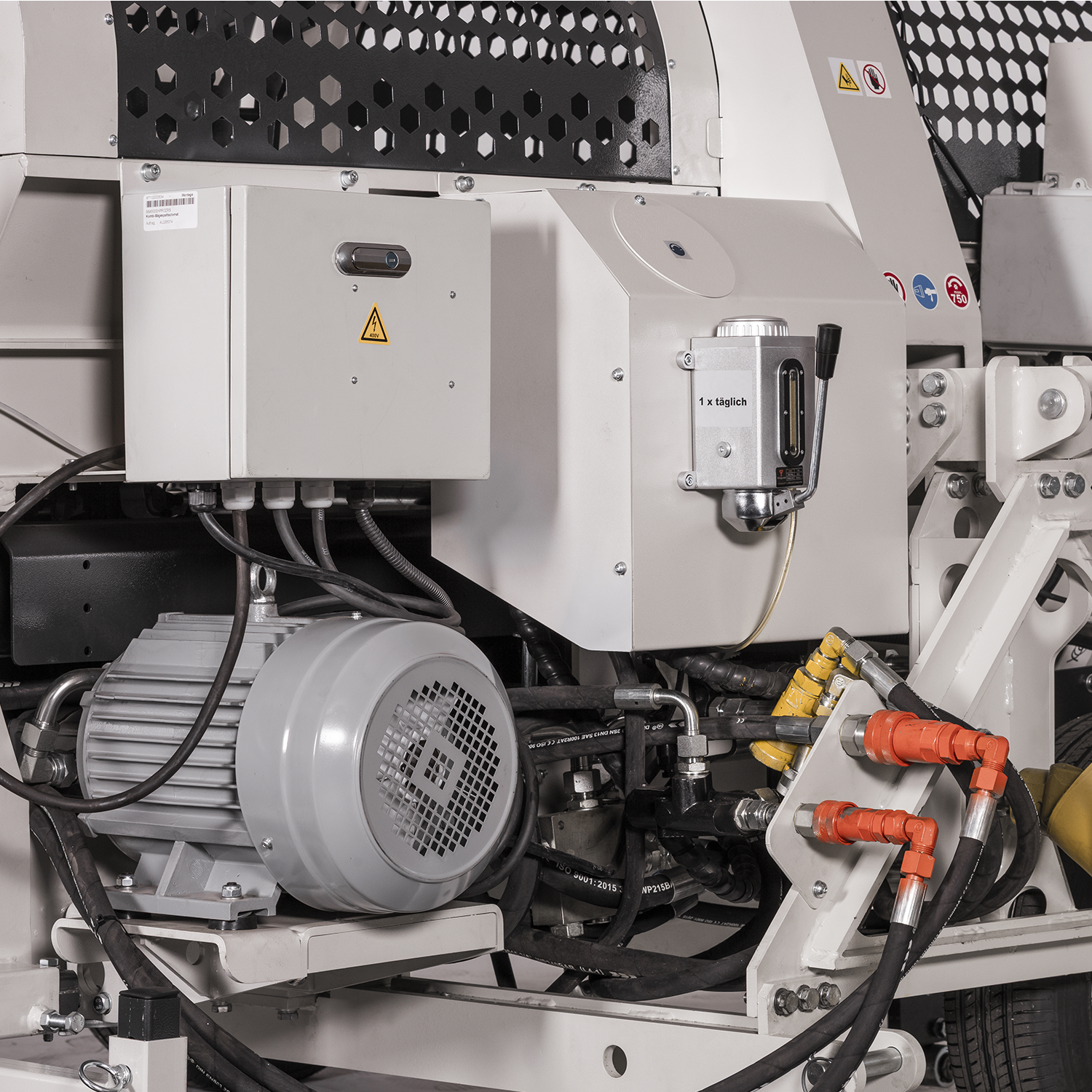 Seadet käitab 400 V kolmefaasiline elektrimootor võimsusega 9.5 kW ja voolutugevusega 18.4 A. Elektriline ajam tagab stabiilse ja ühtlase töö ilma heitgaasideta, mis muudab masina sobivaks kasutamiseks tootmisruumides ja varjualustes. Hüdrauliline süsteem juhib nii kettsaagi, lõhkumissilindrit kui ka konveierit, võimaldades sujuvat ja sünkroniseeritud töötsüklit.