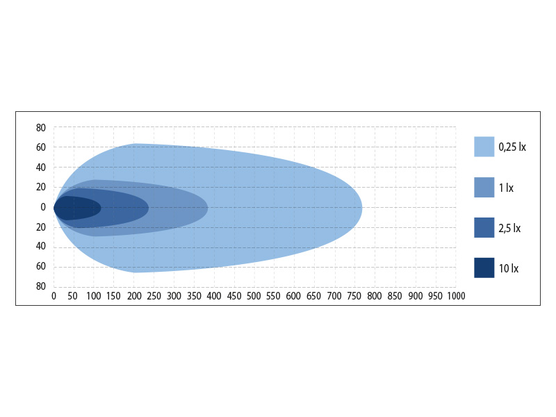 1 lux tasemel umbes 425 meetrit kombinatsioonivihus (combo beam), spot-versioonil veel kaugemale (~ 545 m).